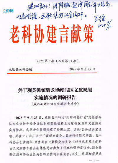 內江市副市長、威遠縣委書記蘭徐在《關于觀英灘鎮騎龍坳度假區文旅規劃實施情況的調研報告》上作出批示