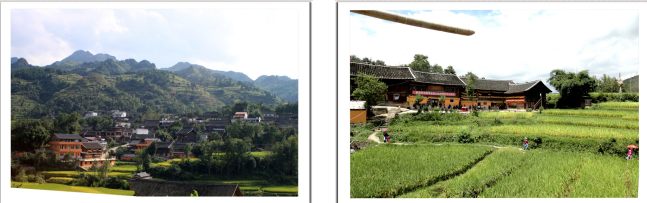 苗寨地型是一個大坡,藍天白云下的山峰顯得格外陡俏,陡俏山峰同時也成為寨子后山的天然屏障,坡的上半部分是天然的植被山清樹綠,下半部分是成片的良田,層層疊疊依坡而建的瓦房相對集中在坡左側的半坡上,瓦房基本上都是一樓一底。一條小溪從坡右側流下,橫穿坡低向左側流出。