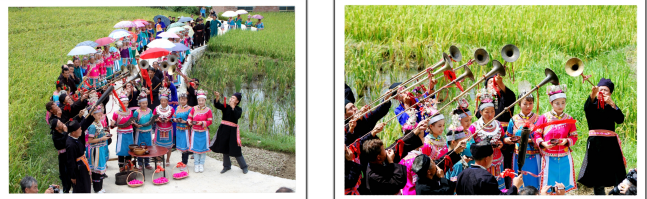 攔路酒隊伍站在路中間,不喝酒是對苗族人不禮貌,是不能進寨的。前面10多支嗩吶架成人字架,敬酒的婦女站中間。這里的嗩吶管可能有3米長,珙縣苗族的嗩吶管大多數只有22~30厘米長。