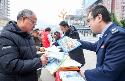 2024年12月2日,四川省廣安華鎣市的憲法宣傳志愿者,在鎣城街頭向市民發(fā)放憲法等法治知識宣傳資料。(邱海鷹 劉南賢)