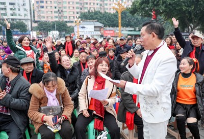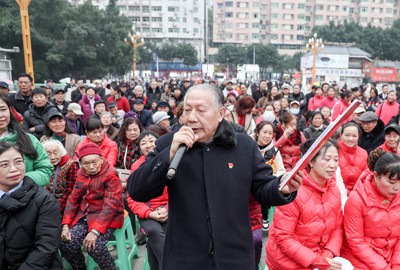 2024年12月2日,四川省廣安華鎣市的憲法宣傳志愿者,在華鎣山廣場為市民展演法治文藝節(jié)目。